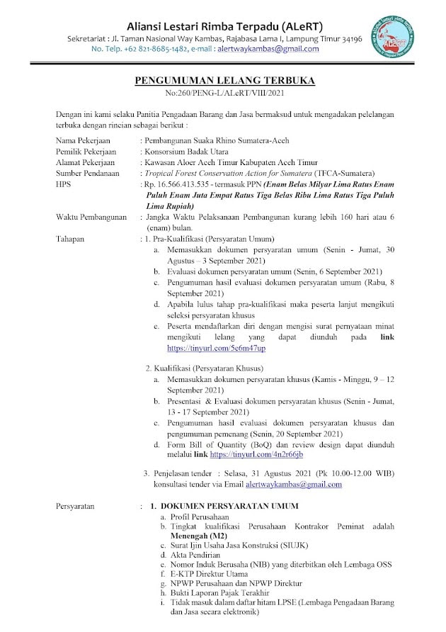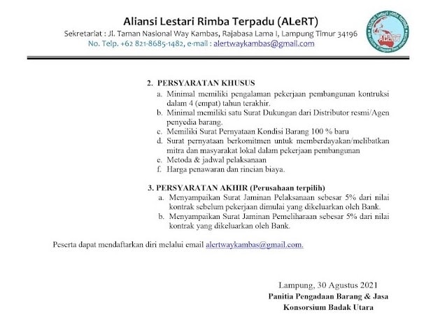 Aliansi Lestari Rimba Terpadu (ALeRT) akan bertindak sebagai pelaksana dan panitia pengadaan barang dan jasa. Informasi lebih lanjut mengenai alur, persyaratan dan tenggat waktu tercantum dalam surat pengumuman di bawah ini. Para peminat diharap mengisi pendaftaran dan ketentuan yang disyaratkan dalam dokumen sebagai berikut: