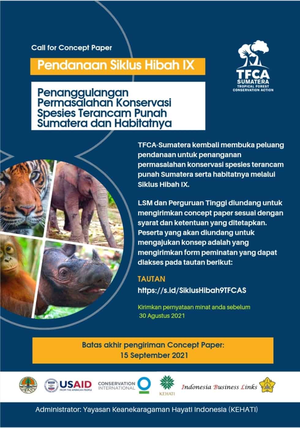 Proponen diharapkan dapat mengusulkan proyek yang memberikan dampak nyata, signifikan, dan berkontribusi pada peningkatan viabilitas populasi spesies kunci terancam punah di Sumatera dan habitatnya (Orangutan, Harimau Sumatera, Gajah Sumatera, dan Badak Sumatera).